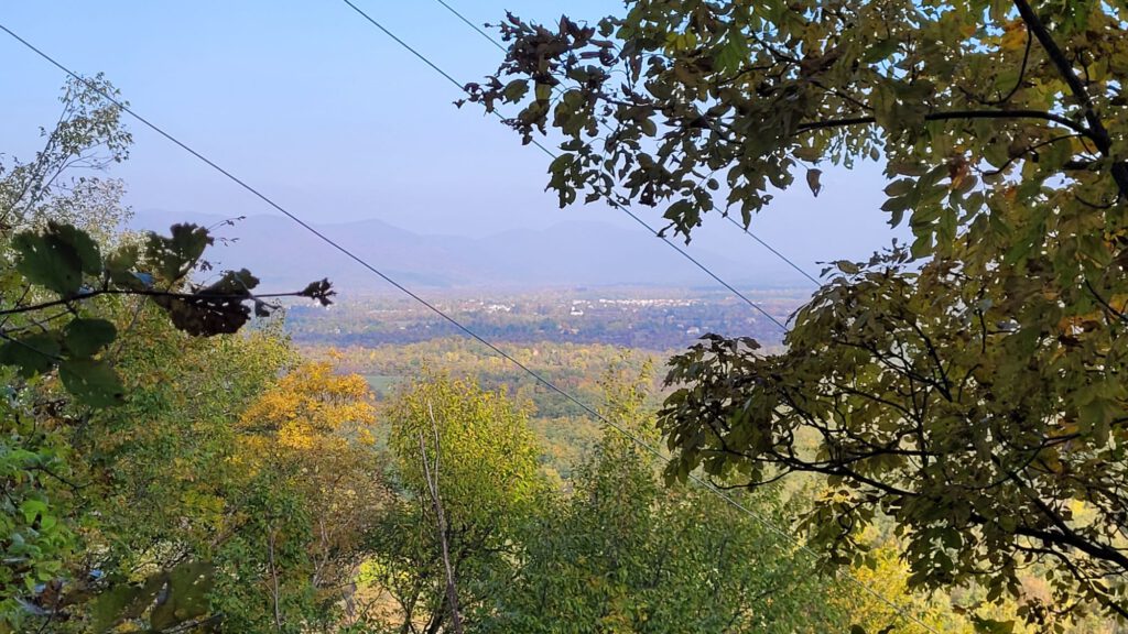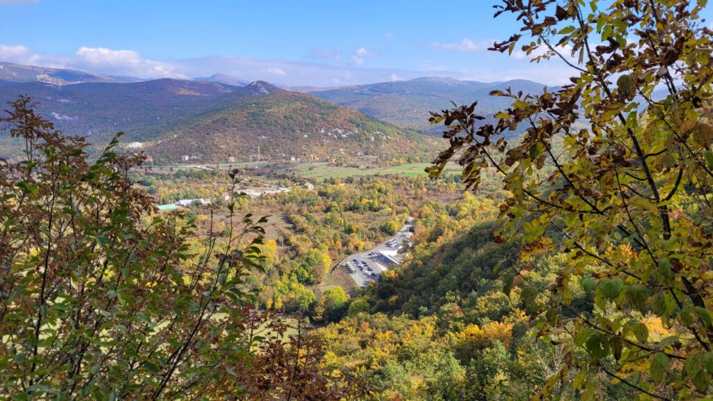 Hier noch ein kurzer Rückblick auf den Parkplatz. Das Grau im grün dort unten.