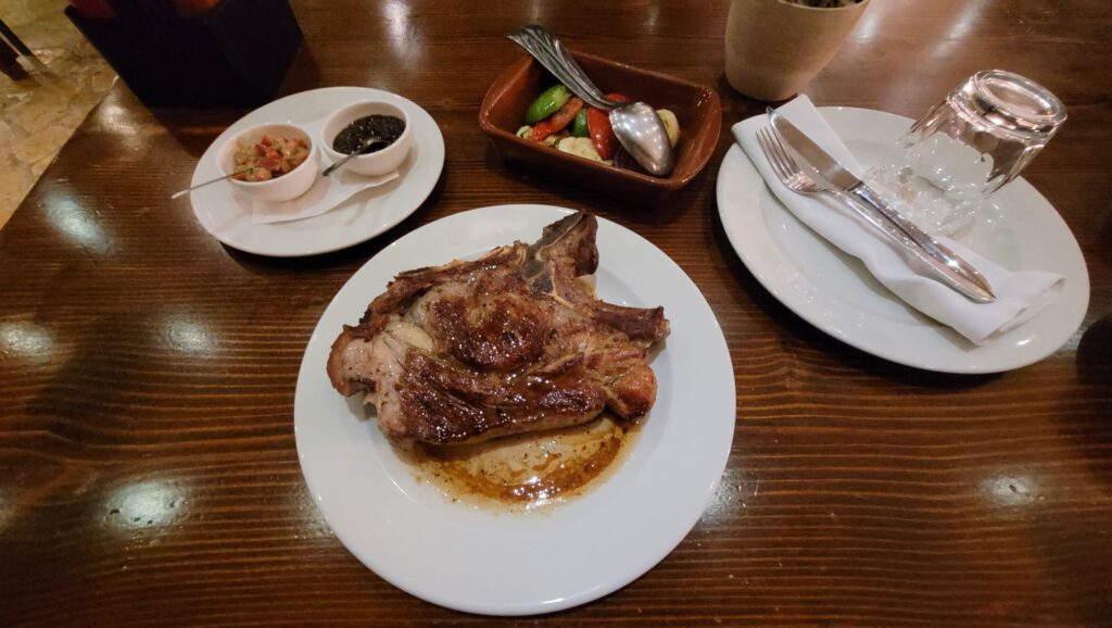 Eine Portion Kalbskottlett. Oh man, ich hatte gedacht, es wär kleiner. Aber superlecker war es trotzdem und perfekt mit Grillgemüse dazu. Habs nicht ganz geschafft. Aber den Rückweg ohne Navi im Dunkeln…